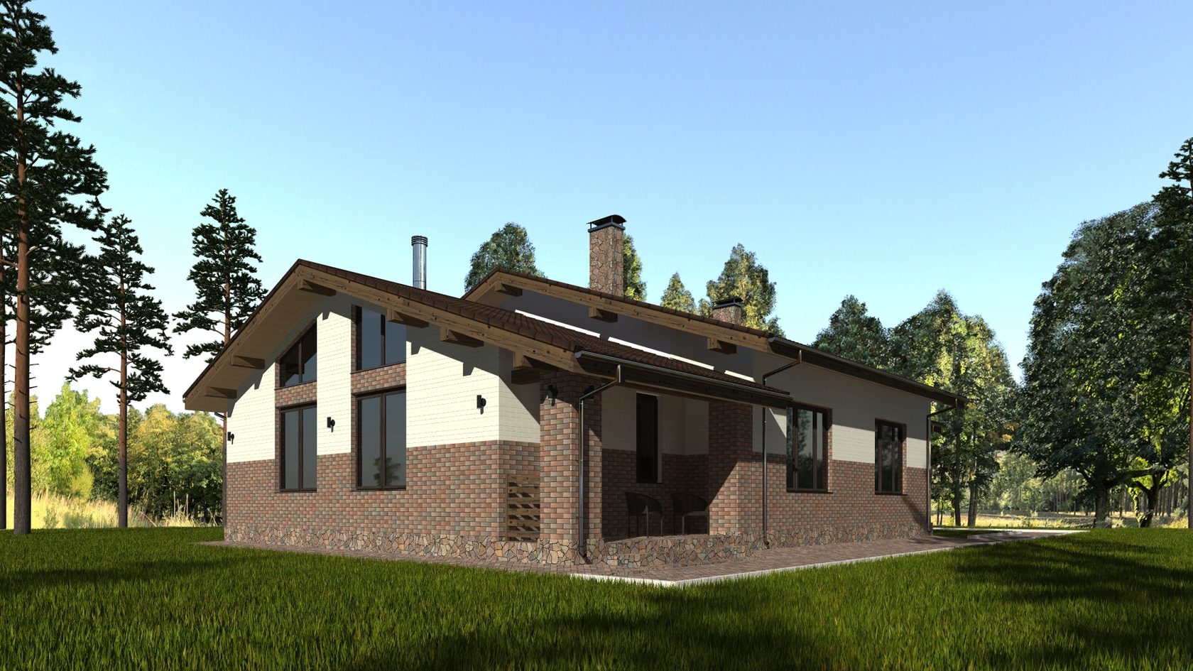 Одноэтажный дом из газоблоков с кирпичной облицовкой, практичной планировкой внутренних помещений и сауной внутри дома
